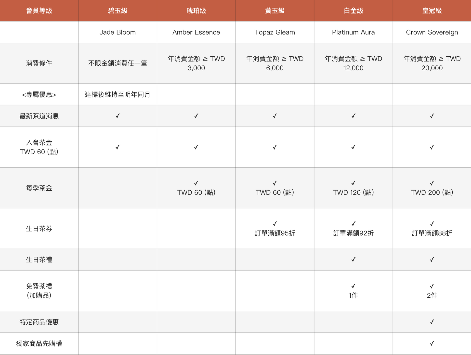 我們依據不同會員等級,準備了專屬的心意與禮遇, 願您在每一杯茶的溫潤之中,緩緩感受身心的沉靜與流動。